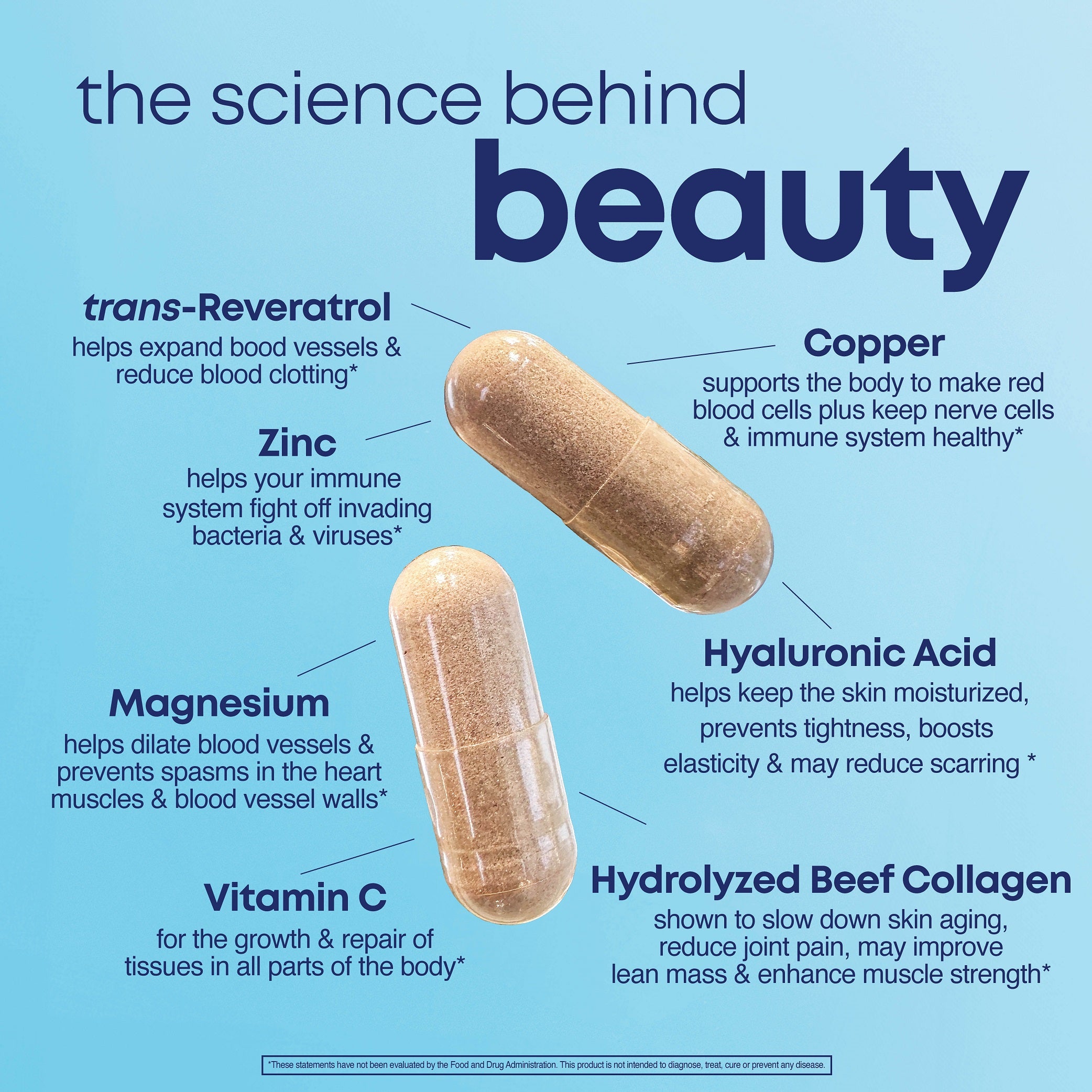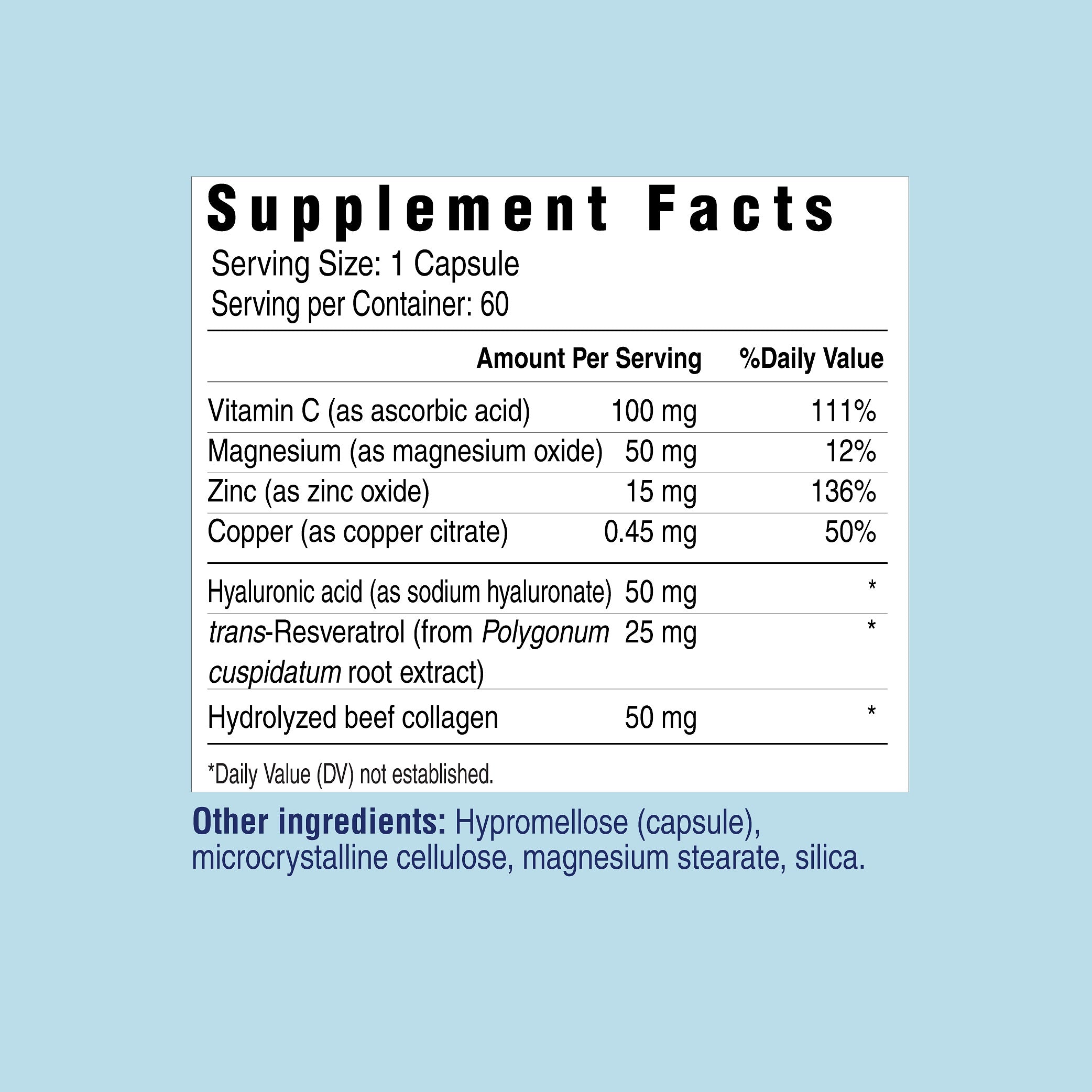 Beauty capsules also includes vitamin C and trans-Resveratrol both known to enhance supple skin to help fight the signs of aging. Vital minerals are in the formula such as magnesium, copper, and zinc. Many people have incorporated zinc in their daily regimen to promote immune health and enhance metabolism. Beauty is more than skin deep, so incorporating Her Own Beauty daily may promote skin health from the inside out.